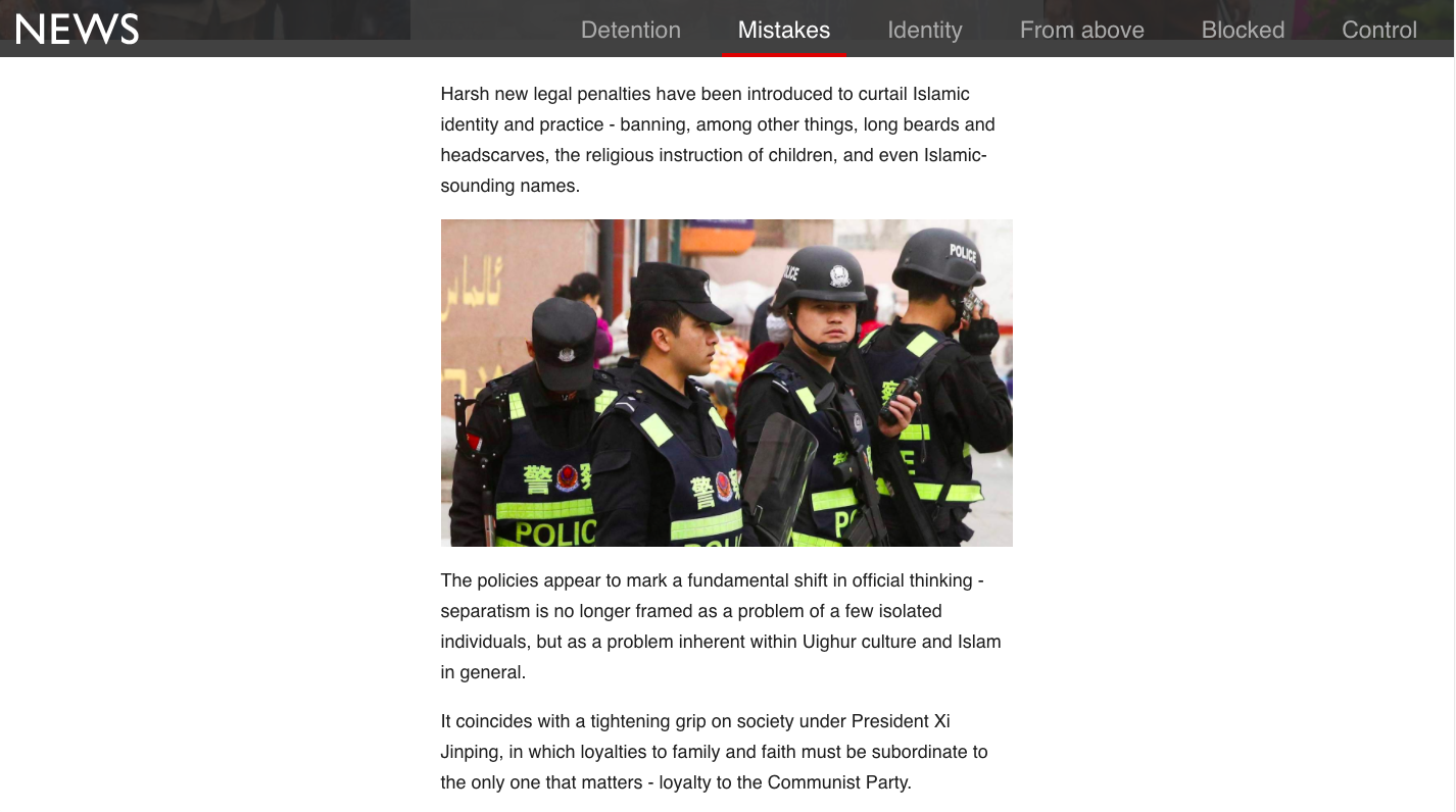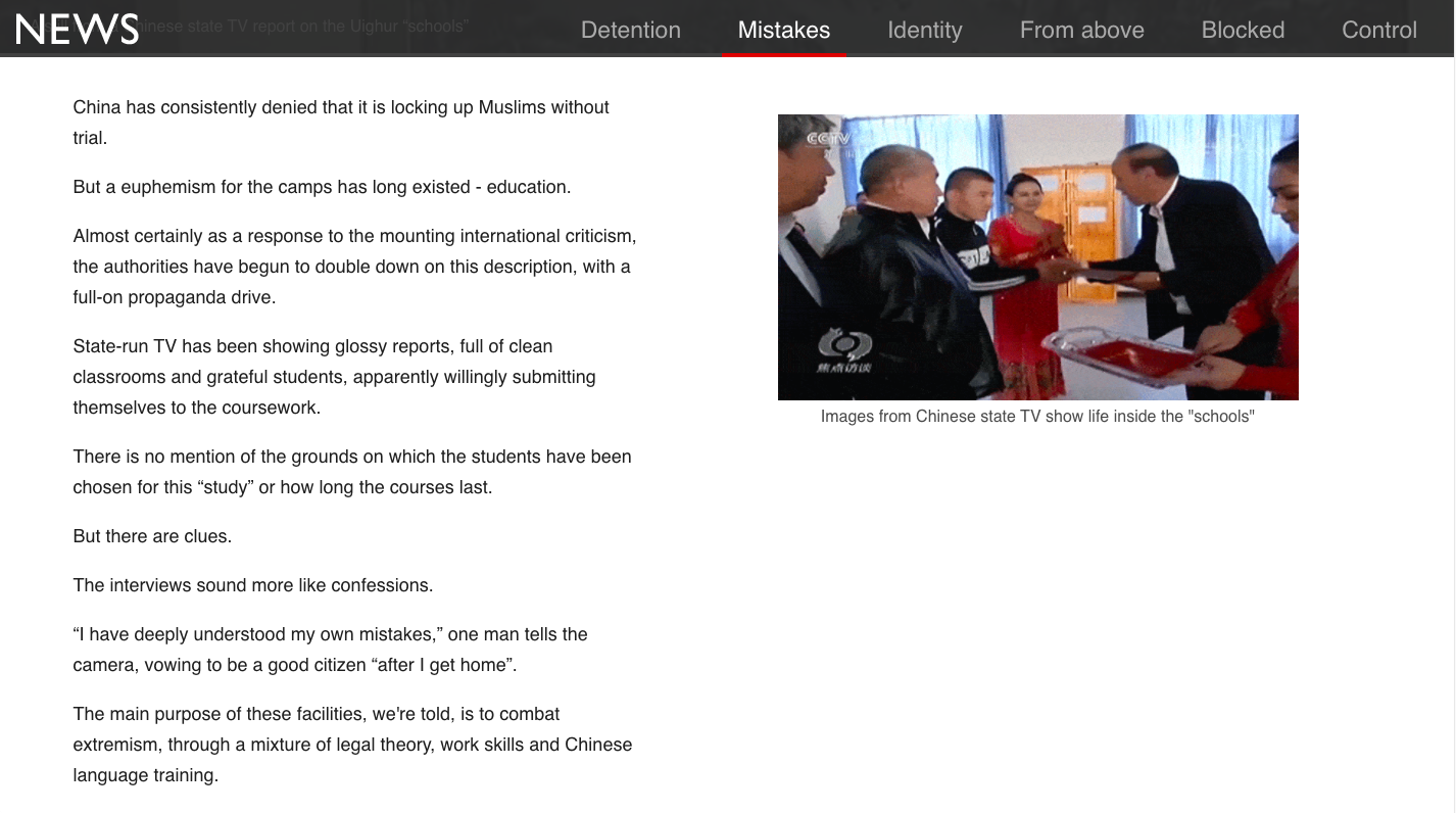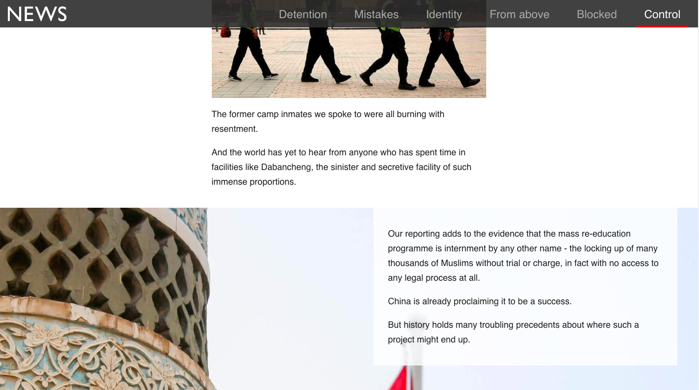 BBC汇总大量实拍图片、调查纪录、谷歌地球图像和媒体曝光材料,制作新疆集中营专页“China’s hidden camps“,并将中共的新疆策略总结为: