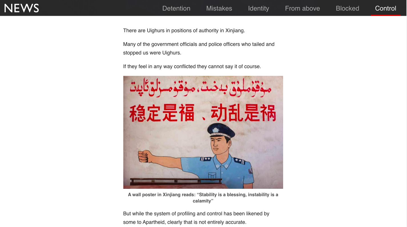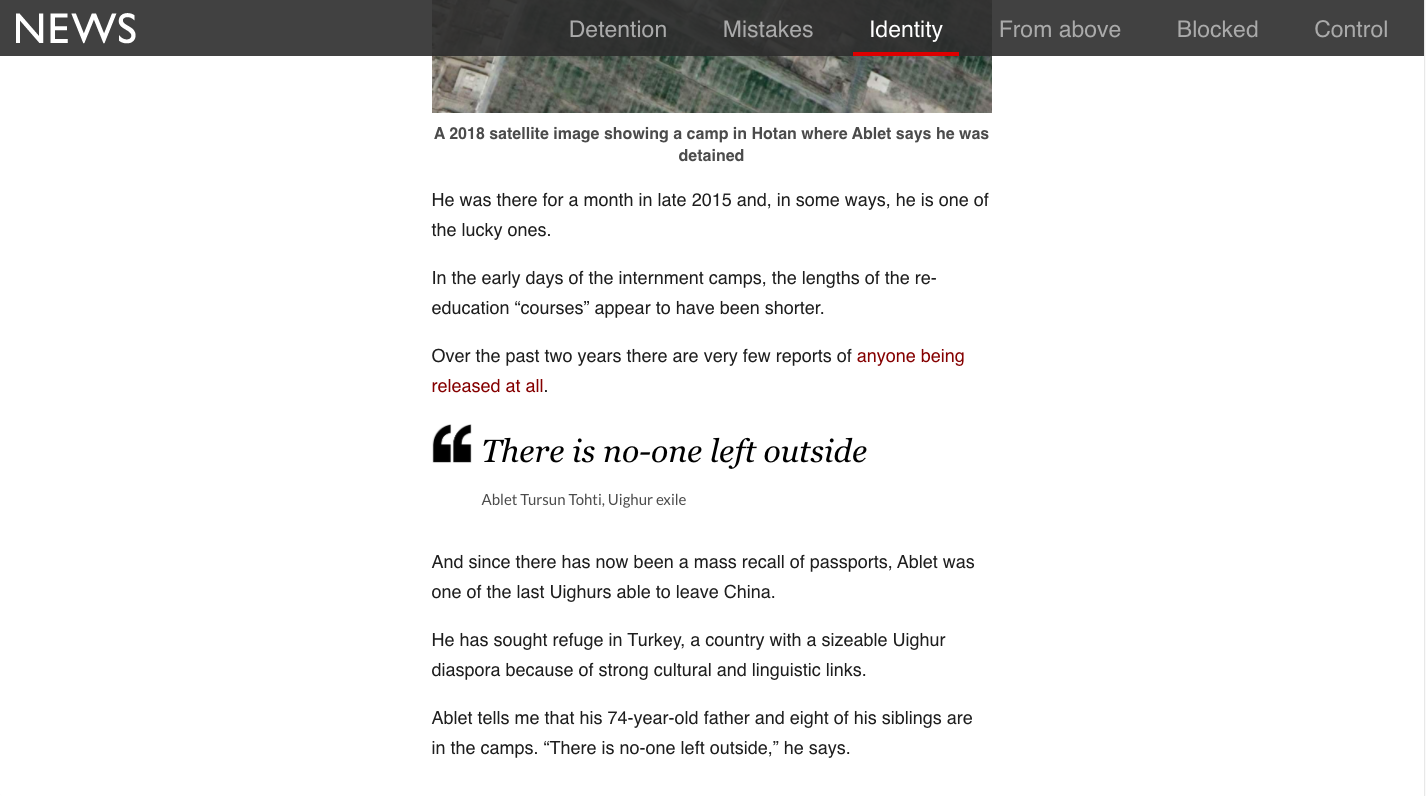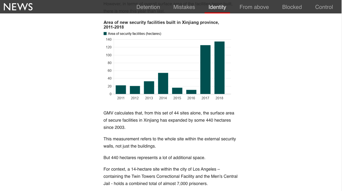 BBC汇总大量实拍图片、调查纪录、谷歌地球图像和媒体曝光材料,制作新疆集中营专页“China’s hidden camps“,并将中共的新疆策略总结为: