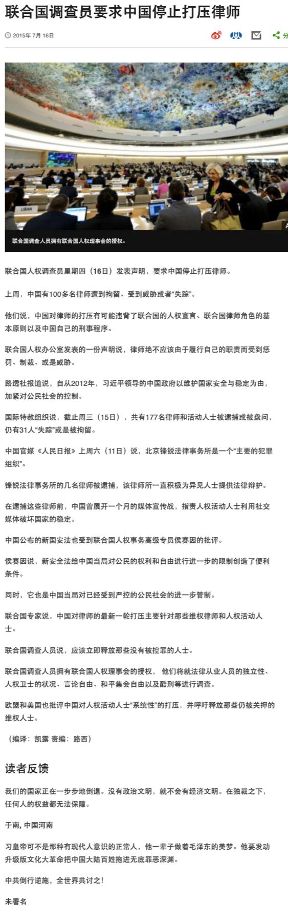 BBC消息,联合国人权调查员16日发表声明,要求中国停止打压律师