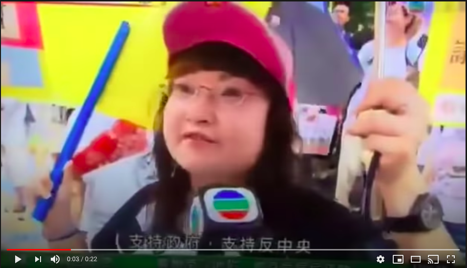 亲建制派公关公司主席周融,在1月底政改座谈会曾被3位浸大女生现场KO,4月开始又发起“反占中大联盟“,7月起工联会接棒发起“反暴力反拉布“游行,期间一位女士接受记者采访时称“支持政府,反中央“,后经身边人提醒改口“反占中“,还将“周融”称为“张融”。拜托了临演大姐,你拿了人家钱起码也背熟台词啊