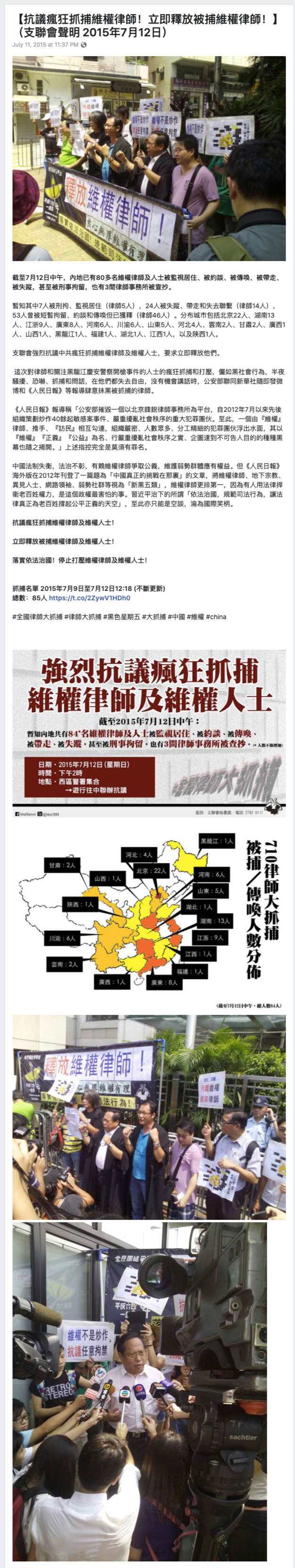 香港支联会7月15日于facebook发声明“抗議瘋狂抓捕維權律師!立即釋放被捕維權律師!”