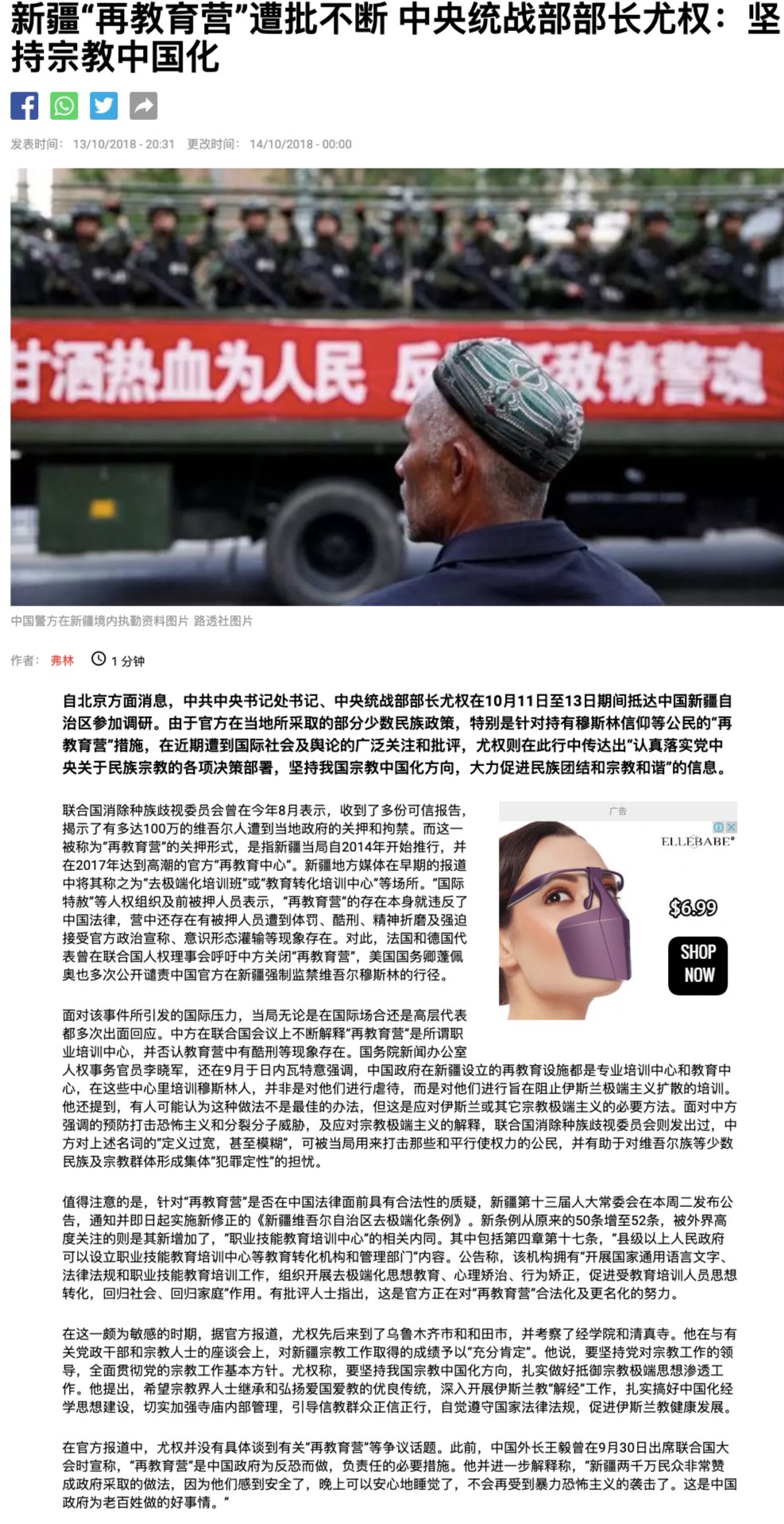 消息原文:新疆“再教育营”遭批不断 中央统战部部长尤权:坚持宗教中国化